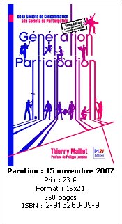 Après le succès de la première édition, M21 Editions, éditeur avant-gardiste, spécialiste des nouvelles technologies, du management et de la prospective, publie une seconde édition du livre de Thierry Maillet, Génération Participation, enrichie à la suite des dernières élections et de la très forte … participation. Ce livre renouvelle la vision de la consommation, des entreprises et de la politique en y intégrant les attentes citoyennes grandissantes. Consommer et voter ne suffisent plus, l’individu veut participer pour se sentir utile avec : Blogs, Associations, Démocratie Participative, Actionnariat Populaire…