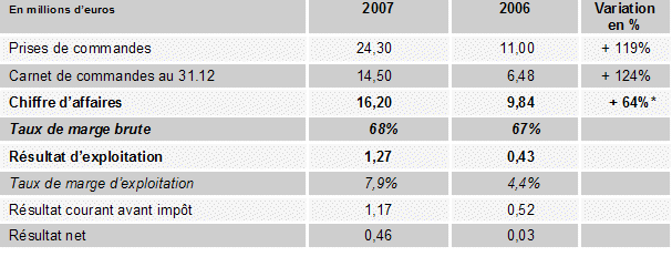 Emailvision a connu un développement soutenu tout au long de l’année 2007. Ce dynamisme commercial s’est traduit par un doublement de sa base de clientèle (+ de 1 000 clients à fin 2007). Le chiffre d’affaires a progressé de 64% à 16,2 M€ et les nouvelles prises de commandes (bookings) de 119% à 24,30 M€.