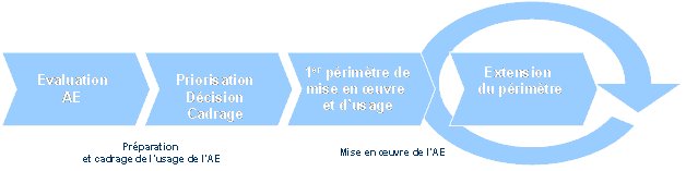 En quelques mots, la mise en place d’une démarche d’Architecture d’Entreprise débute par une phase d’évaluation : un état des lieux qui permettra d’identifier et de prioriser les chantiers à mener, en complément de l’évaluation de la maturité vis-à-vis des pratiques d’AE. La mise en pratique de l’AE se réalise par étapes successives sur des périodes de 3 à 6 mois pour couvrir des périmètres métiers de plus en plus ambitieux, avec à chaque itération, des résultats visibles. Un des critères de réussite étant l’adhésion de l’ensemble des parties prenantes, la définition du périmètre est donc particulièrement déterminante pour créer la dynamique autour de la démarche.