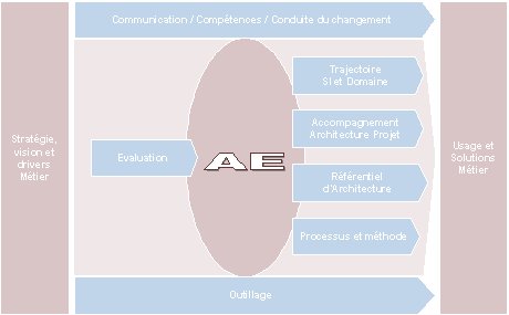 • Un package d’évaluation de la maturité des pratiques d’architecture d’entreprise, et des aptitudes au niveau d’une organisation suivant plusieurs axes : contexte de l’entreprise, processus & organisation, référentiel d’architecture, compétences, outillage et risques