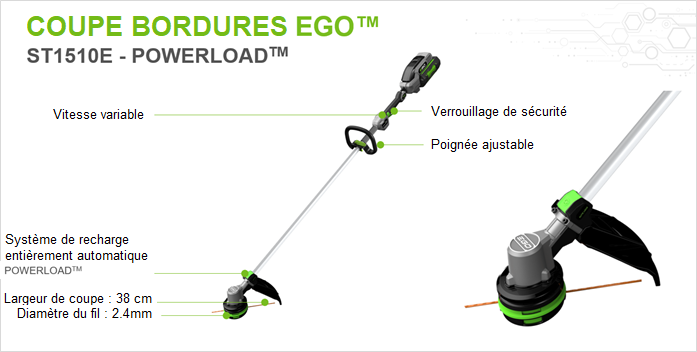 Pour charger le fil de coupe dans la bobine du ST1510E d’EGO Power+ il suffit de se munir de 4 m de fil nylon torsadé ∅ 2,4 mm, de l’insérer de part et d’autre dans la bobine en équilibrant les longueurs. Ceci fait, on appuie sur le bouton vert Powerload™ de rembobinage et le système enroule alors parfaitement le fil de coupe dans la bobine en moins de 10 secondes… l’appareil est prêt! En cours d’utilisation, une simple frappe au sol permet de faire avancer le fil pour le mettre à la bonne longueur.