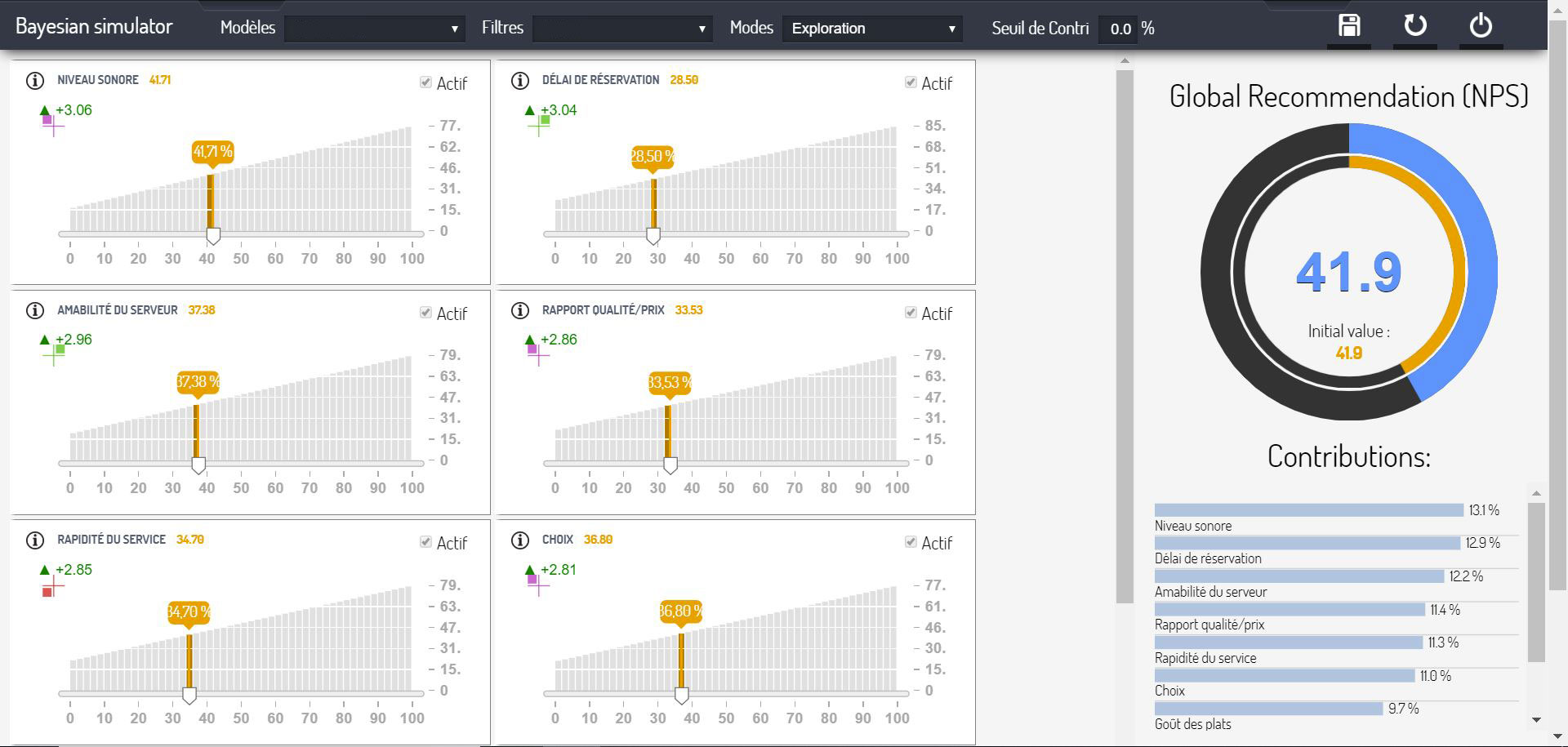 Le Simulateur Bayésien de Socio Data Management rend intelligible l’analyse complexe des données pour un public non statisticien, grâce à une interface de visualisation dynamique. Il permet aux équipes marketing de simuler et déterminer de quelle façon optimiser leurs indicateurs clés, les leviers à actionner et dans quelles mesures.