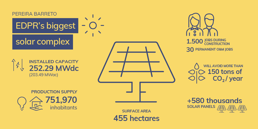 Madrid et Paris, le 8 octobre 2021. EDP Renewables (Euronext : EDPR), quatrième producteur mondial éolien et solaire, annonce l’ouverture de sa plus grande centrale solaire dans l’état de São Paulo, qui sera la cinquième plus importante du Brésil, avec une capacité installée de 252 MWp. Situé à Pereira Barreto, ce parc solaire sera le plus grand jamais développé, construit et opéré par le groupe dans le monde.