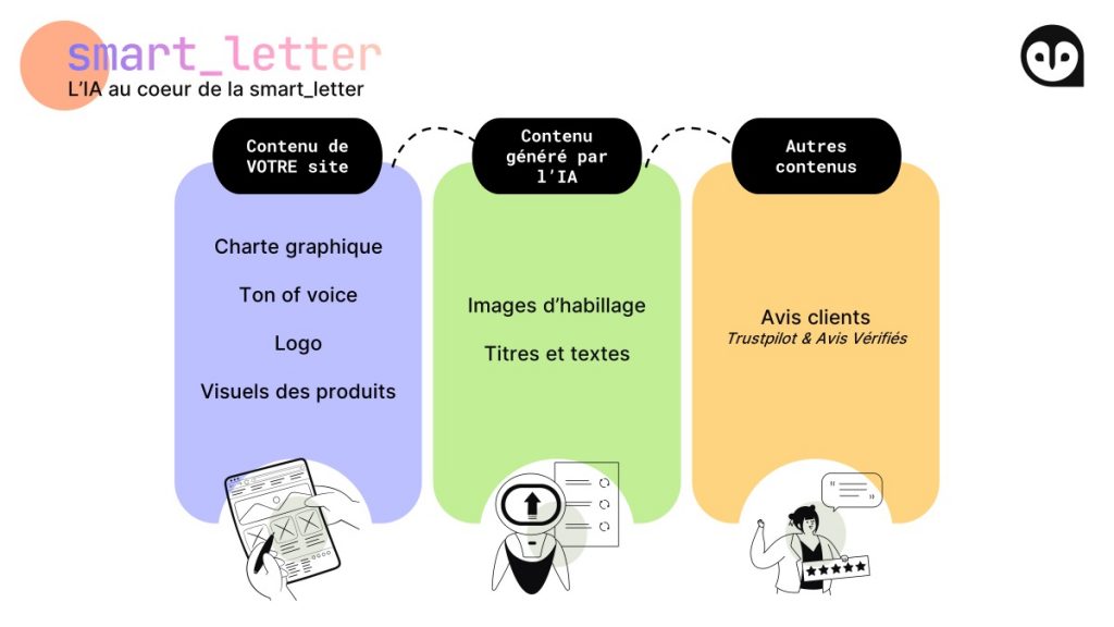 Génération automatique d’emails avec des images et du texte proposés par l’IA, issus du site e-commerce ou créées, l’affichage des meilleurs avis pour chaque produit, et une sélection des destinataires pour un impact maximal. Une vraie rupture technologique !