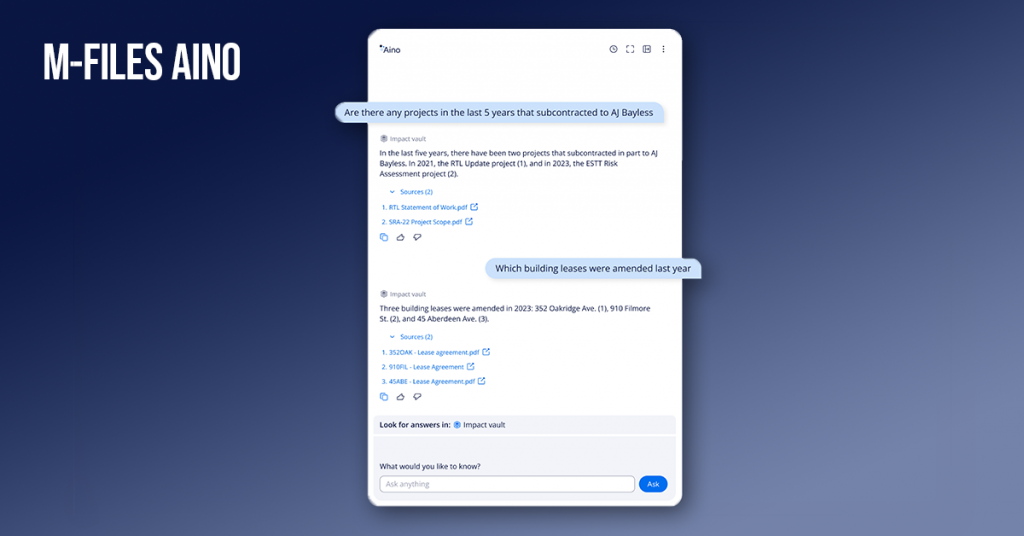 Avec M-Files Aino, les collaborateurs peuvent traiter de gros volumes de données rapidement, obtenir des réponses à des questions complexes, et aboutir plus vite à des conclusions. M-Files Aino comprend le contexte métier, en accédant uniquement aux données pertinentes qui sont autorisées pour chaque utilisateur. La structure basée sur les métadonnées de M-Files assure la connectivité, la confidentialité et le nettoyage des données, permettant ainsi une expérience d’IA de plus grande qualité. Répondant aux plus hauts standards de sécurité des données et de conformité réglementaire, M-Files Aino s’assure que toutes les interactions sont protégées et régies par les politiques de l’organisation.