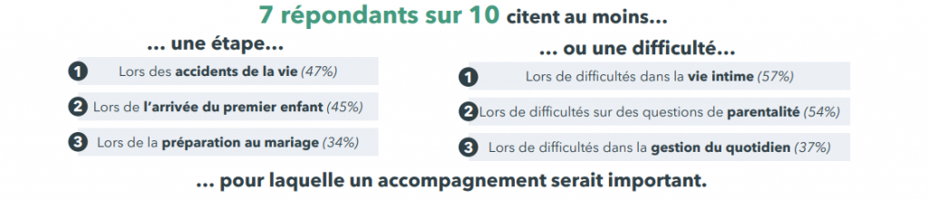 Livrés à eux-mêmes, et pour ne plus improviser, 7 Français sur 10 estiment qu’un accompagnement serait important lors de certaines étapes comme des accidents de la vie (47%), l’arrivée du premier enfant (45%), ou la préparation au mariage (34%), mais aussi lors de difficultés dans la vie intime (57%), sur des questions de parentalité (54%) et dans la gestion du quotidien (37%).
