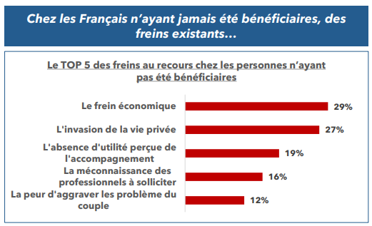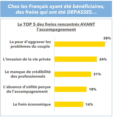 Il est intéressant de remarquer que chez les Français ayant déjà bénéficié d’un accompagnement, la peur d’aggraver la situation arrive en première position de leurs freins avant de franchir le pas (28%). 24% redoutaient l’invasion de la vie privée, 21% n’avaient pas confiance dans les professionnels, 18% n’étaient pas convaincus de l’utilité d’une telle démarche, et le frein économique arrivait en dernière position, avec 16%.