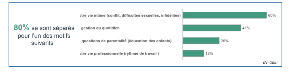 Selon une étude sur la relation conjugale et les besoins d’accompagnement des couples français, menée pour le compte de Coopleo.care, la première plateforme de mise en relation avec des professionnels du couple, les principaux motifs de séparation reposent sur la vie intime (conflit, sexualité, infidélités) à 60%, la gestion du quotidien à 41%, les questions de parentalité à 26% et la vie professionnelle à 15%.