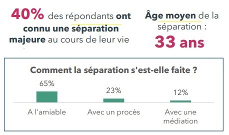 Dans cette étude menée par le cabinet indépendant Koréis avec l’aide d’un comité constitué de chercheurs et de professionnels, auprès de plus d’un millier de Français, 40% des répondants ont connu une séparation majeure au cours de leur vie : veuvage, divorce, rupture de PACS, rupture avec vie commune longue durée, avec enfants ou projets d’enfants. Parmi ces répondants, 57% sont des femmes et l’âge moyen de la séparation est de 33 ans. Les deux tiers (65%) des séparations se sont faites à l’amiable (i.e. sans procédure juridique ou médiation).