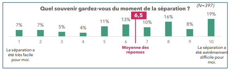 A la question « Quel souvenir gardez-vous du moment de la séparation », 19% répondent que la séparation a été extrêmement difficile pour eux avec une note de 10, sur une échelle de 1 à 10, de très facile à extrêmement difficile. 6,5 étant la note moyenne.
