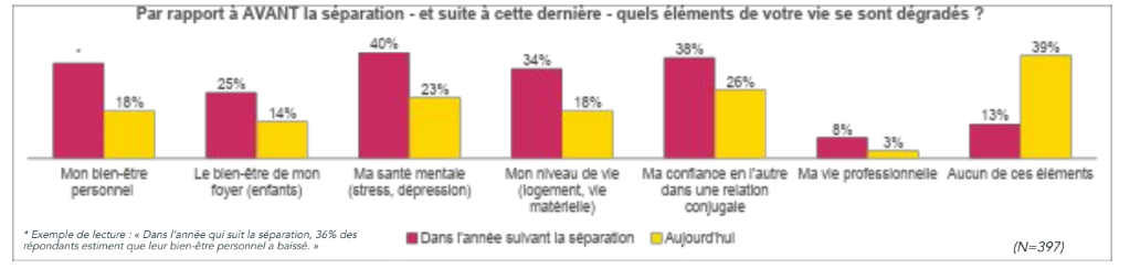 A court terme, pour les personnes ayant vécu une séparation, l’étude révèle une dégradation de la santé mentale (40%), de la confiance en l’autre (38%), du bien-être personnel (36%) et du niveau de vie (34%), des conséquences qui, si elles peuvent s’atténuer dans le temps, ne disparaissent pas complètement.