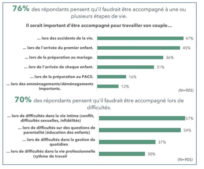En écho aux causes de séparation, 70% voient l’accompagnement utile lors de difficultés dans la vie intime (57%), de conflits relatifs à l’éducation des enfants (54%), à la gestion du quotidien (37%) et à la vie professionnelle (30%).