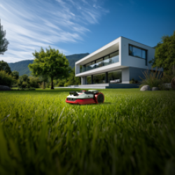 Robot de tonte Kress EyePilot sur jardin devant une belle maison moderne